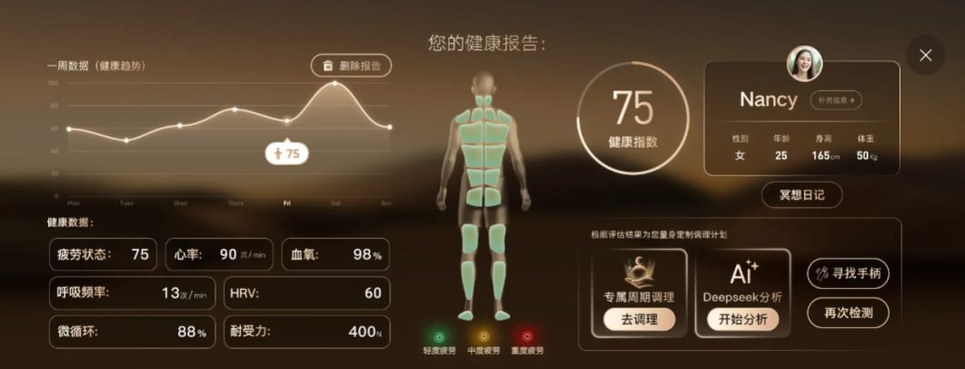 其后,奥佳华2021年提出“家庭健康入口”战略,试图将按摩椅升级为健康数据终端——通过体征检测、远程问诊、智能家居联动,打造“产品+服务”闭环。在智能硬件领域,奥佳华近年押注的AI按摩椅OG-8900系列,堪称技术集大成者:华为鸿蒙系统支持物联网联动,4D温感机芯实现毫米级穴位定位,甚至与医疗机构合作开发“亚健康指数评估系统”。公司推出的AI按摩机器人超感至臻版接入DeepSeek大模型,也是基于这一思路做延伸,通过多模态算法实现健康数据采集、分析与按摩方案生成。