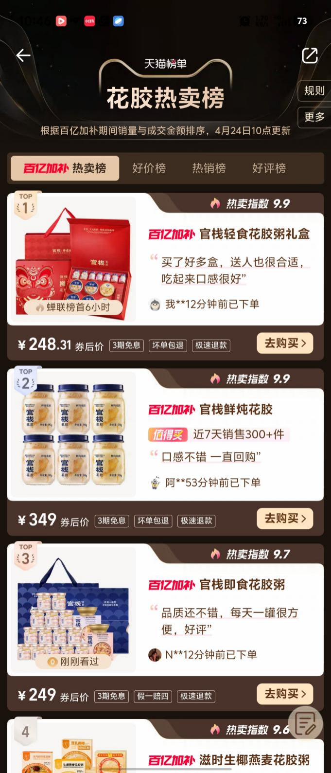 其次,在花胶细分领域,官栈面临着"传统品牌转型"与"新兴品牌模仿"的双重压力。传统滋补巨头如东阿阿胶、同仁堂加速布局即食化产品,凭借品牌溢价和渠道优势抢占市场份额;而新兴品牌如胶趣、花胶世家则通过低价策略和社交营销分流消费者。此外,燕窝、阿胶等品类的头部品牌如小仙炖、福胶也在跨界竞争,进一步加剧了市场的复杂性。