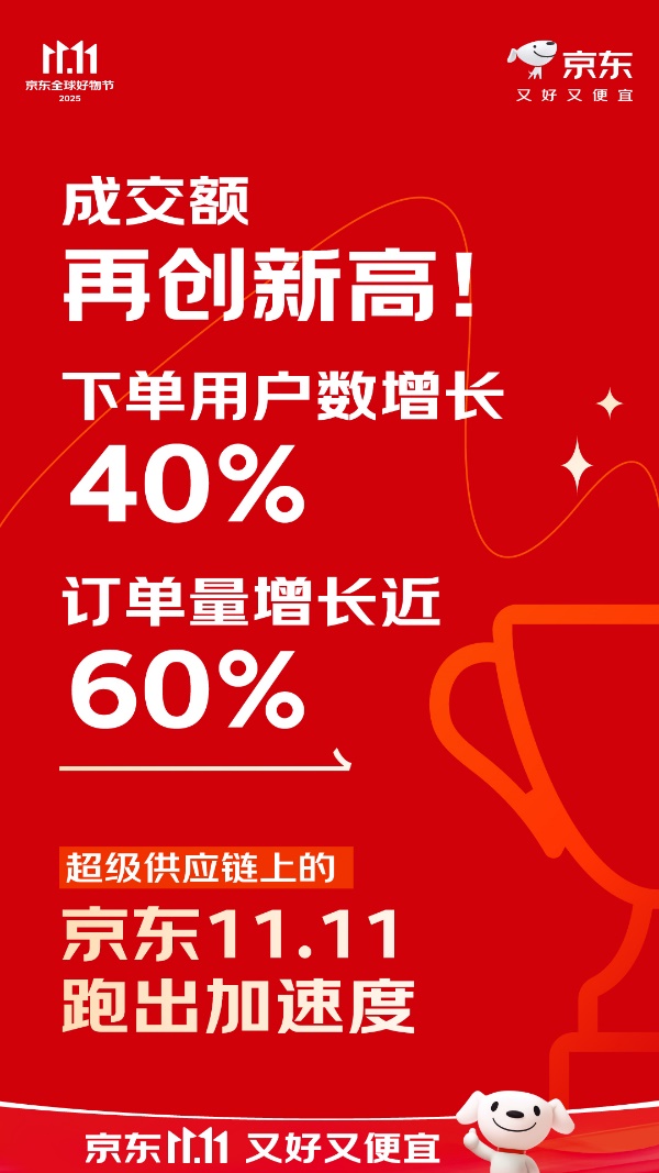 截至2025年11月11日23:59,京东11.11成交额再创新高!下单用户数增长40%!订单量增长近60%!三方数据显示,京东APP活跃用户增长幅度稳居行业首位,在产品、价格、服务的综合体验上京东收获了最高的消费者好评度。超级供应链上的京东11.11跑出加速度!