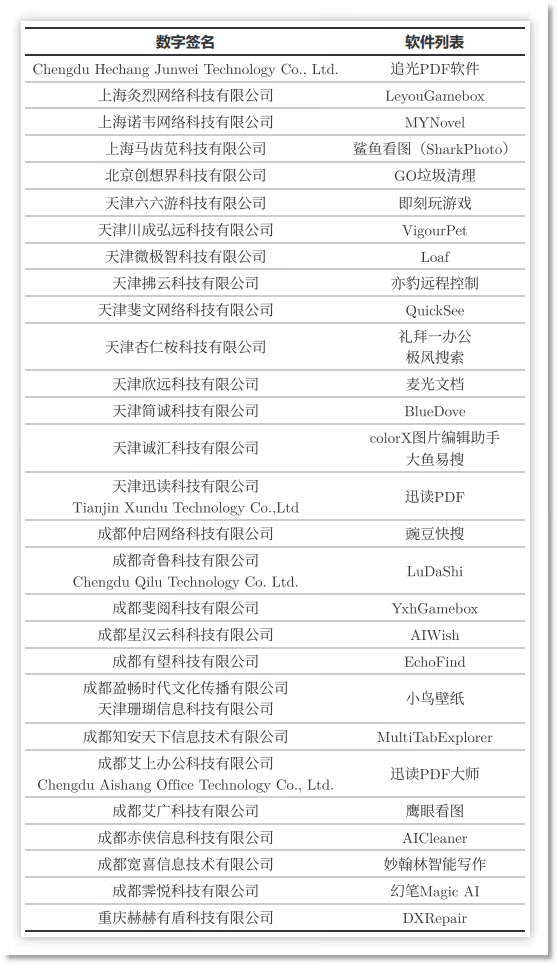 根据火绒安全情报中心的统计数据,大量软件包含本文所述的推广模块。下图中列表列出的软件被发现与本次威胁具有较强相关性(包括但不限于):