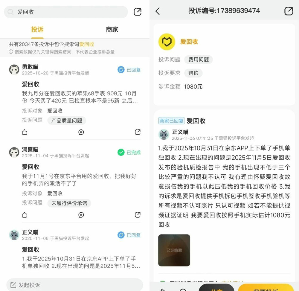 截至目前,黑猫投诉平台上包含搜索词“爱回收”的投诉高达20347条,其中大部分投诉内容涉及恶意压价,还有售后服务拖延、二手产品质量差等问题。某种程度上,爱回收如今面临的最大挑战是如何维系好用户体验,保证用户能继续留存。