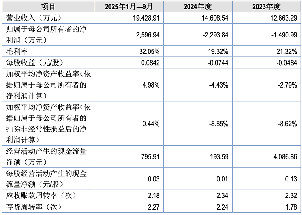 2023年、2024年、2025年1-9月,云岭光电经审计的营收分别为1.27亿元、1.46亿元、1.94亿元,归母净利润分别为-0.15亿元、-0.23元、0.26亿元,毛利率分别为21.32%、19.32%、32.05%。