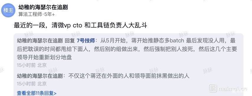DoNews11月12日消息,据职场社交平台脉脉爆料,清微智能内部乱斗,VP和CTO带着工具链负责人搞内耗,底下干活的兄弟快被逼疯了。从5月开始强推静态多batch结果根本没人用,耽误了进度就把锅全甩给下面兄弟。更离谱的是别的组好不容易做出成果,领导层直接把人按死重新划分地盘。