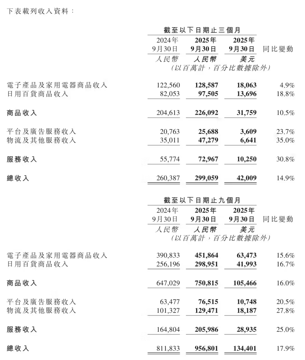京东零售 2025 年第三季度录得收入人民币 2506 亿元(352 亿美元),较 2024 年第三季度增加 11.4%。
