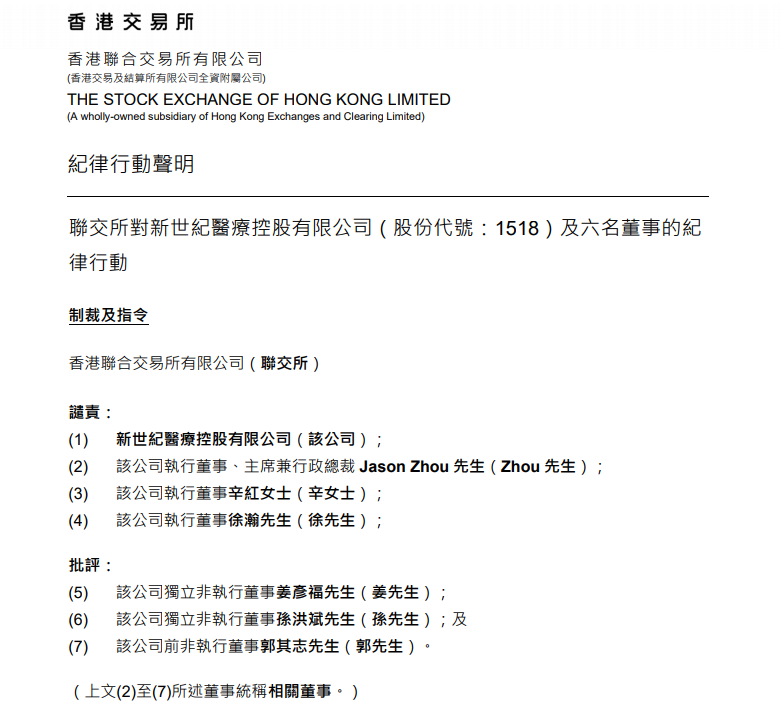 该公司及多名董事因关联交易违规导致数亿元亏损,于2025年6月遭到港交所公开谴责。港交所的谴责进一步加剧了市场对新世纪医疗的信任担忧,叠加内部治理漏洞,其经营颓势也随之持续发酵。