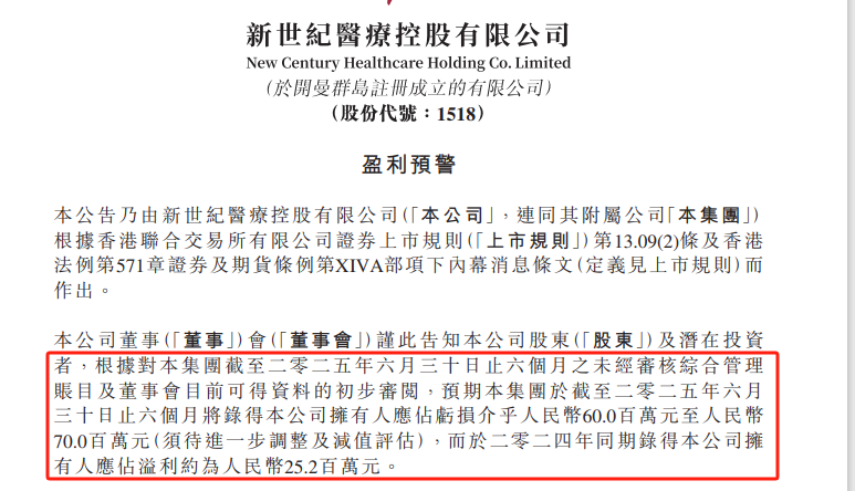 据新世纪医疗发布的财务预警,2025年上半年,公司拥有人应占亏损预计介于6000万元至7000万元之间,较2024年同期2520万元的净利润,实现了近亿元的断崖式下滑。且公告中特别提示“须待进一步调整及减值评估”,这一表述暗示当前6000万至7000万元的亏损或只是“冰山一角”,后续公司实际亏损规模仍存在进一步扩大的可能。
