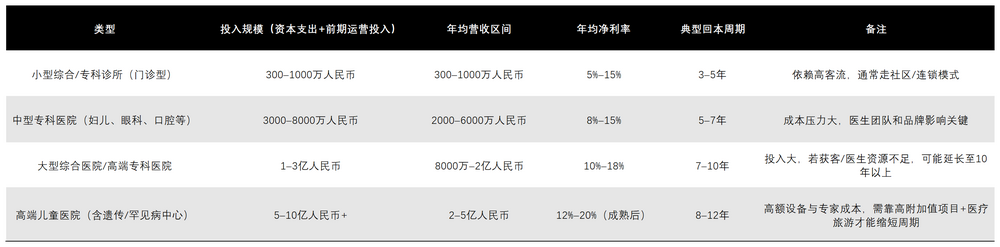 医疗行业本身具有重资产、慢回报的属性;而儿科医疗机构的回本周期,相较其他细分领域还要更长。例如,新世纪医疗评估其新建医院的“现金流平衡期”为 3–4年,而投资回本周期为 7–9年。