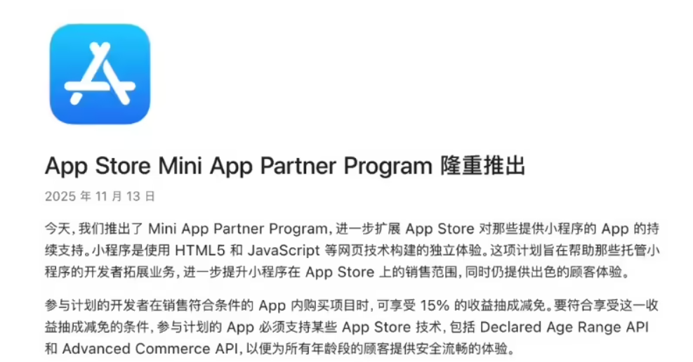 开发者若想加入该计划,需满足以下条件:应用需在App Store的iOS和iPadOS平台上架;所有托管的小程序需符合《数字产品许可协议(DPLA)》和《App 审核指南》,尤其应关注指南的4.7条款—— 小程序、小游戏、流式游戏、聊天机器人、插件和游戏模拟器” 的具体要求,并提供苹果批准的清单;需提供符合指引的元数据,明确标识所有小程序内购(含非符合条件项)及数字商品服务,助力用户清晰认知消费内容,同时便于苹果识别符合条件的购买项并应用相应佣金率。
