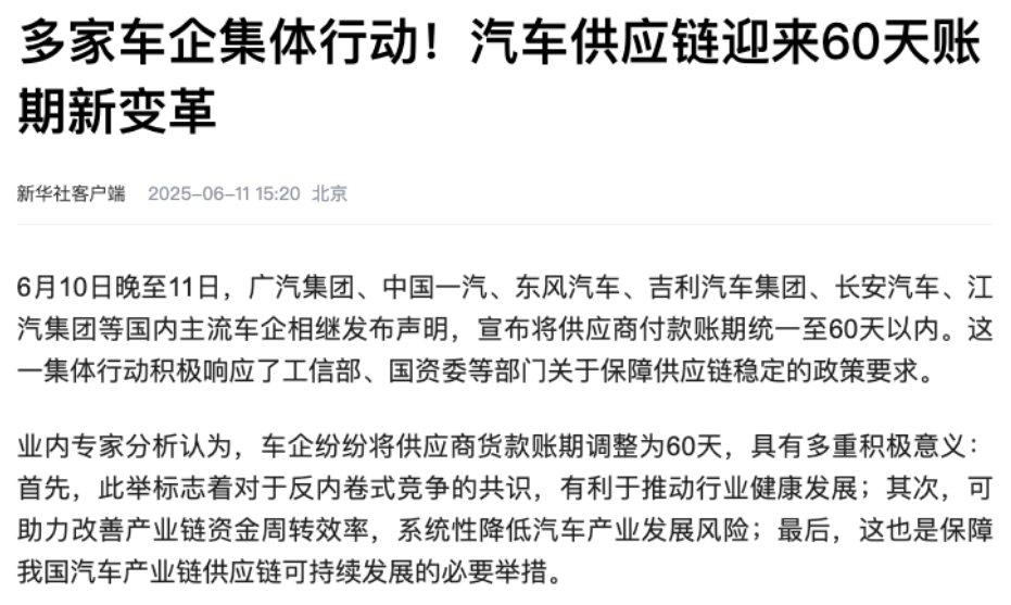 这一困境的背后,既源于“60天回款周期”定义的模糊性——其未明确是从交货日、验收日还是开票日起算,也未界定货款需以现金结算,还是可通过承兑汇票、应收账款电子凭证等非现金方式支付,这种模糊性为主机厂拖延回款提供了操作空间;更源于供应链厂商的被动处境:不少企业受生存压力所迫,秉持“保业务优先于保利润”的心态,对主机厂的账期要求不敢强硬反驳,进一步助长了主机厂的拖延底气。