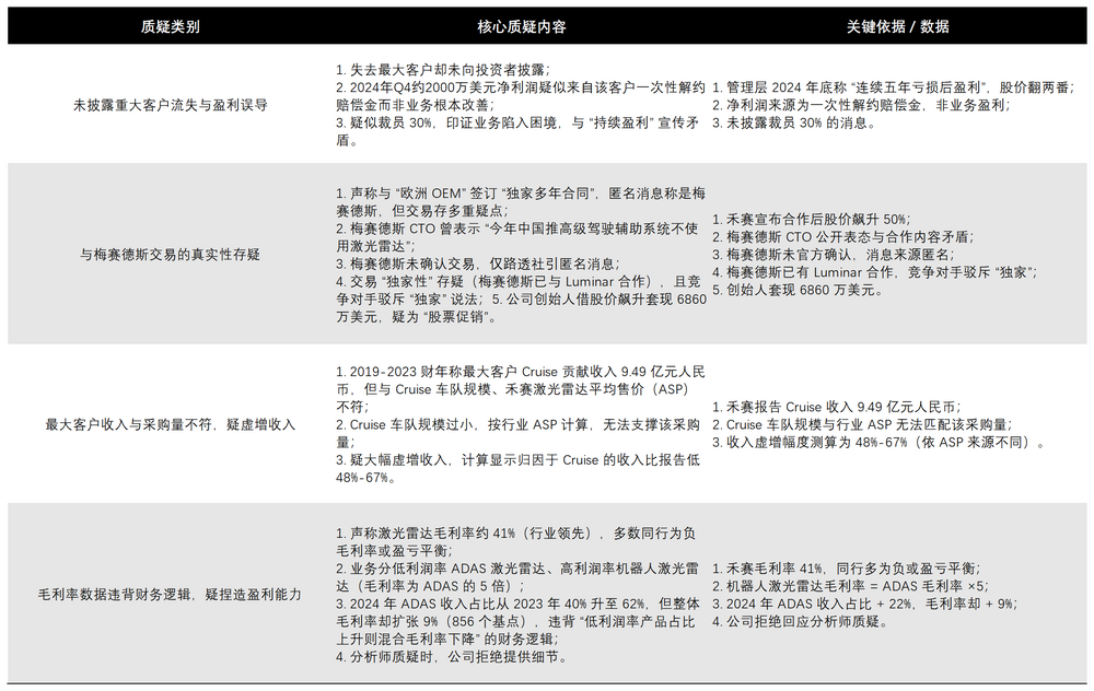 一是资本做空对其声誉构成潜在压力。今年3月份,美国沽空机构Blue Orca Capita在《Blue Orca is Short Hesai Group》报告中对禾赛科技进行指控,包括:未披露重大客户流失与盈利误导(2024年Q4约2000万美元净利润疑似来自该客户一次性解约赔偿金);与奔驰交易的真实性存疑;最大客户收入与采购量不符,疑似虚增收入;毛利率数据违背财务逻辑,疑捏造盈利能力。禾赛科技对Blue Orca Capita的这些指控予以强烈否认,称其为“毫无根据”的指控,并强调公司始终遵守严格的商业道德和监管合规标准。