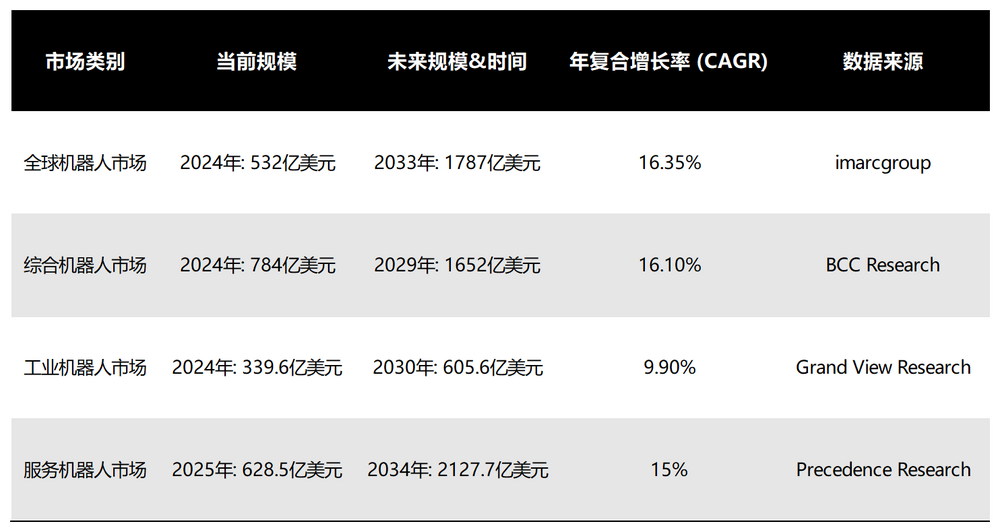 - 从行业潜力看,速腾聚创CEO邱纯潮公开表示,机器人是10倍于汽车市场的应用场景。全球多家机构指出,综合机器人、工业机器人、服务机器人市场规模均呈快速增长之势。Imarc Group预测,2033年全球机器人市场规模将达到1787亿美元。