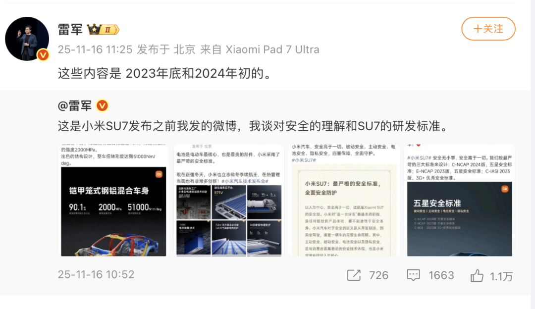 今年9月25日,在年度演讲中雷军曾表示,小米汽车发布以后,成为全网被黑得最惨的品牌之一。他当时就呼吁全社会打击黑公关和黑水军。此次针对“小米汽车重颜值轻安全”这一质疑的回应,是雷军对网络黑水军的再次正面”硬刚”。此外,雷军还附上了2023年和2024年发布的四张微博截图,称“这是小米SU7发布之前我发的微博,我谈对安全的理解和SU7的研发标准。”