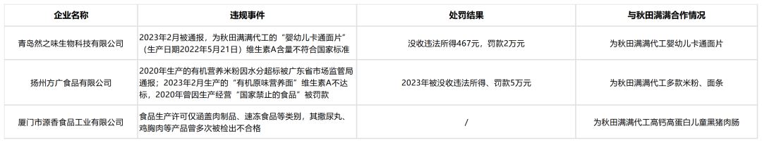 比如,采购的核心目标为降低成本、保障供应效率、供应商关系品控的核心目标为严格把关质量,对不合格原料/供应商行使否决权。当同一负责人同时管理采购和品控时,可能被迫在成本与质量之间做取舍。这种冲突的存在,正是秋田满满合作的代工厂中,多家企业因生产不合格产品被监管部门处罚的原因,这也暴露秋田满满内部管控失衡的问题。