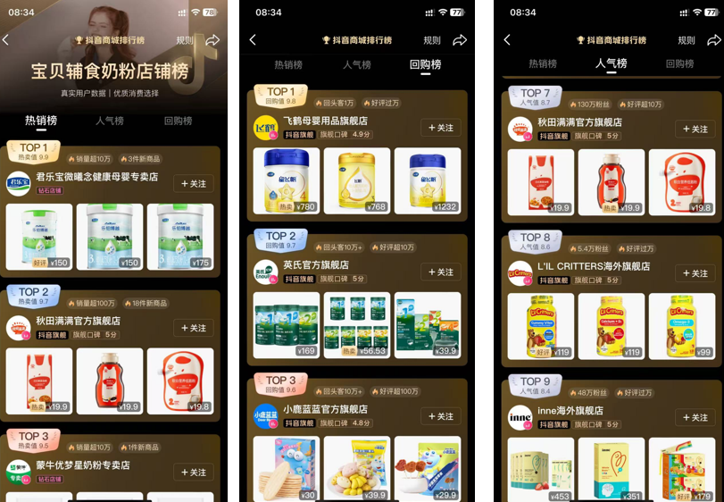 性价比不足直接影响秋田满满的复购率,秋田满满抖音官方旗舰店虽在宝贝辅食奶粉店铺榜热销榜和人气榜TOP10之列,但回购榜TOP20并未看到其身影。