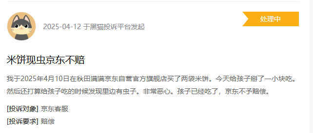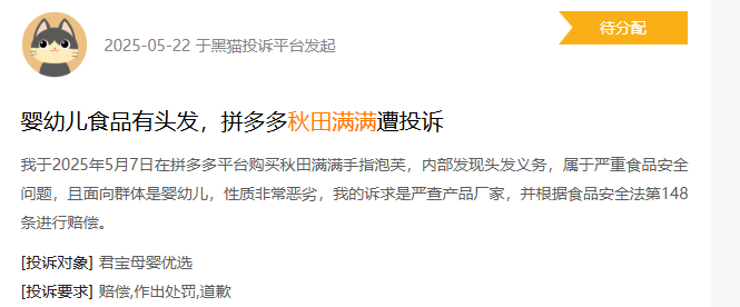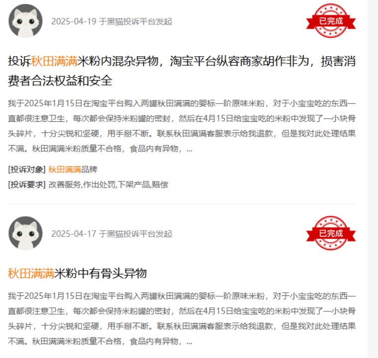 在黑猫投诉平台上,有消费者称在淘宝购买的秋田满满米粉内发现一小块骨头碎片,十分尖锐和坚硬,难以用手掰断。也有消费者称,在拼多多购买的秋田满满手指泡芙出现头发。又有消费者称,在京东旗舰店购买的秋田满满米饼出现虫子,非常恶心。