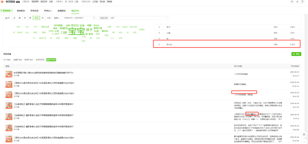 产品贵、分量少、部分产品日期不新鲜、39.9元的产品收到货后仅有3颗葡萄大小、一袋仅有五小包且价格较贵。在秋田满满抖音官方旗舰商品评论区中,对秋田满满产品性价比不足的评论随处可见。且仅有2.35%的“性价比”评价词,更是在众多评价词中垫底。