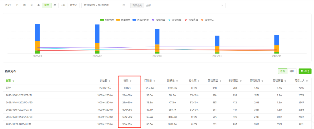另一方面,今年1-3月份秋田满满抖音官方旗舰店销量稳定在50万-75万,4-5月份跌至25万-50万。且5月份为平台618大促期间,但其订单量和带货达人分别为38万单和2811人,较1月份的60.3万单和2079人,均存在明显下滑。