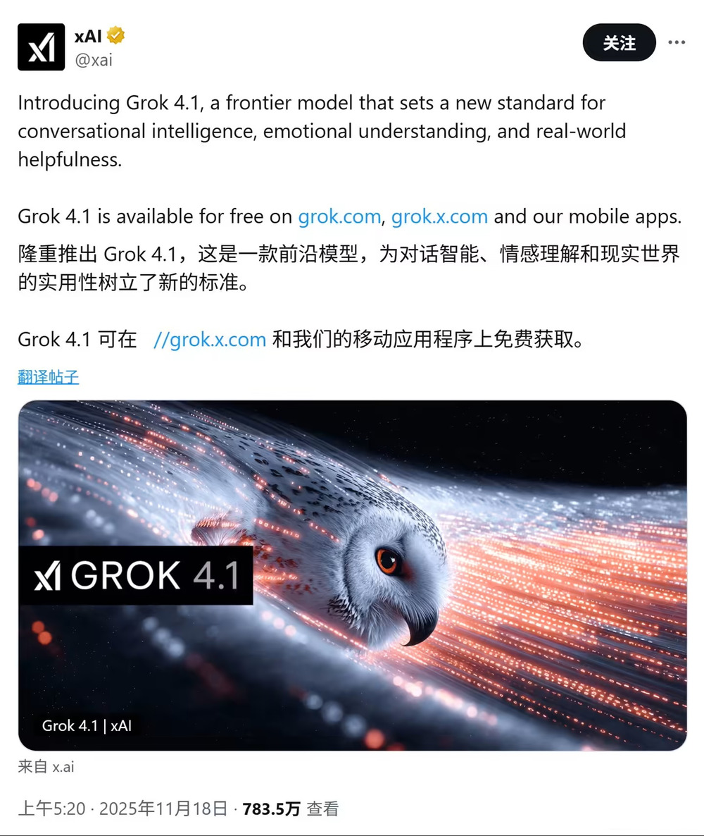DoNews11月18日消息,埃隆・马斯克(Elon Musk)旗下的人工智能公司 xAI 11 月 17 日宣布推出最新大语言模型 Grok 4.1,并已面向所有用户全面推送。