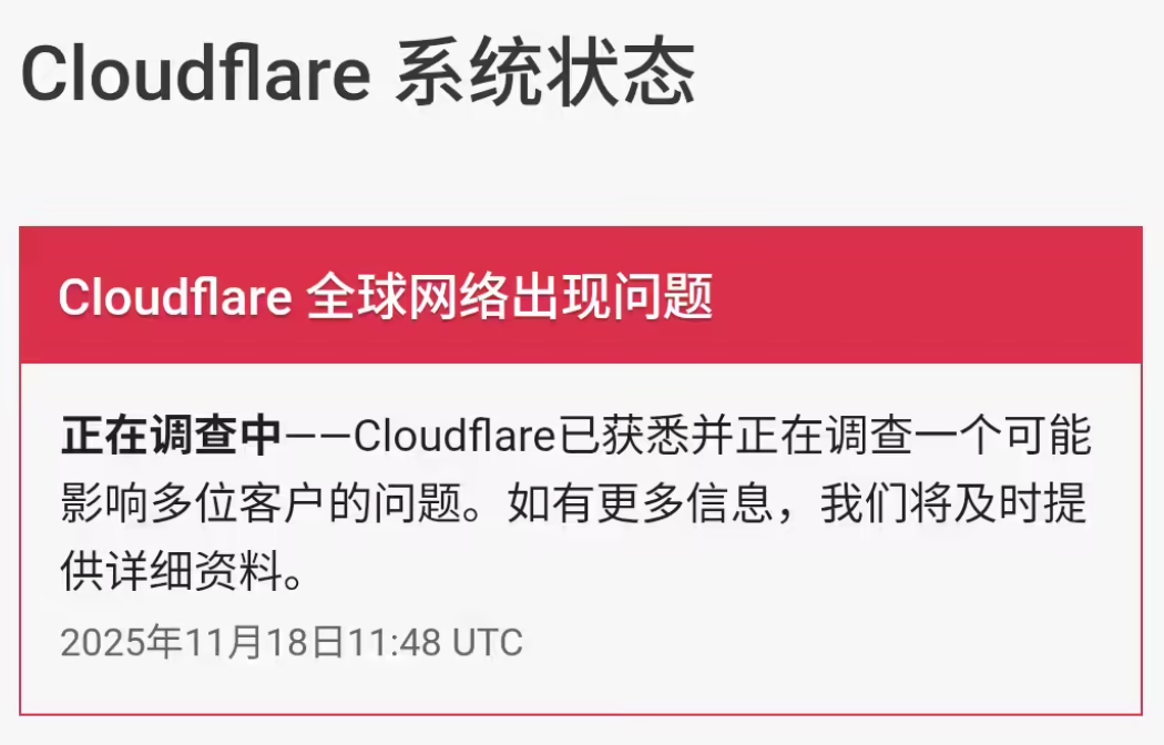 Cloudflare 在最新公告中表示:“Cloudfare 已获悉并正在调查一个可能影响多位客户的问题。如有更多信息,我们将及时提供详细资料。”