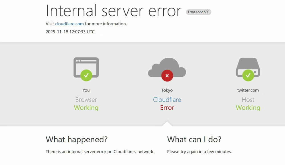 受影响用户所见的错误提示为:“Cloudflare 网络内部服务器错误”,并建议用户“请稍候几分钟后重试”。