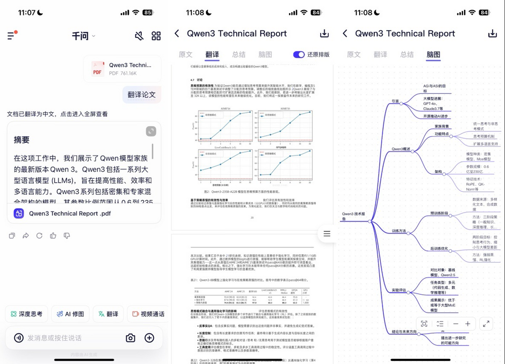 图注:千问App支持一键文档翻译,可在主对话内直接生成译文PDF,还能精准还原排版、生成脑图