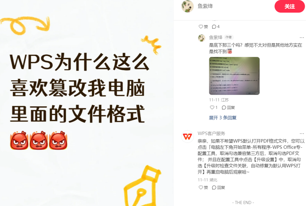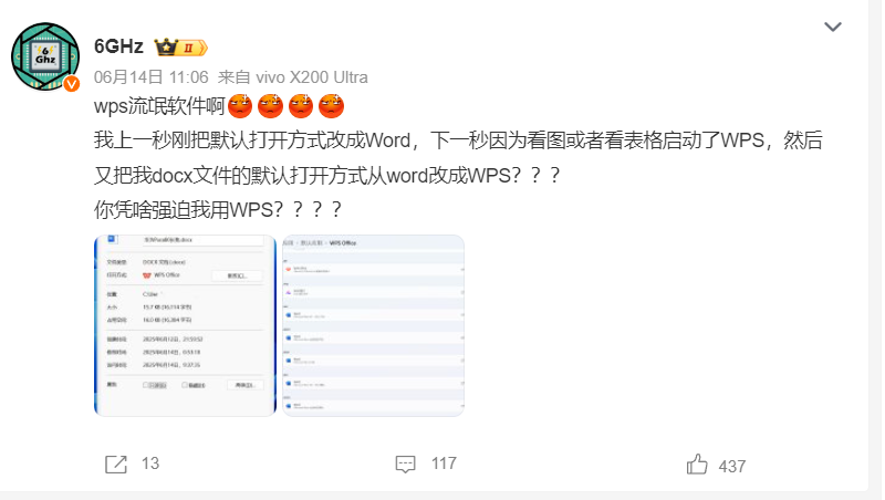 目前在社交媒体上,吐槽WPS篡改文件打开方式的声音极多,这种行为其实比弹窗广告更流氓。知名数码博主6GHz曾表示,上一秒刚把默认打开方式改成Word,下一秒因为看图或者看表格启动了WPS,然后又把我docx文件的默认打开方式从word改成WPS?