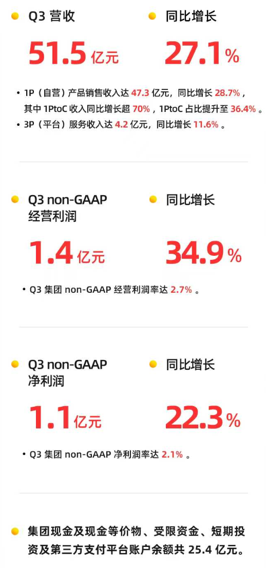 财报数据显示,从营收来看,本季度集团总收入51.5亿元,同比增长27.1%。从营收构成来看,1P(自营)产品销售收入达47.3亿元,同比增长28.7%,持续成为营收增长引擎。3P(平台)服务收入为4.2亿元,同比增长11.6%。