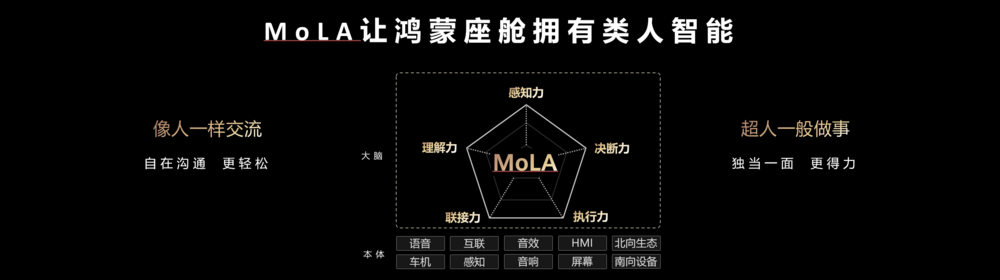 作为 HarmonySpace 5 起采用的核心架构,MoLA 通过融合多模态感知、通用大模型与垂域智能体,搭建起从用户意图到硬件执行的完整链路。其独创的全域免唤醒、导航三模式纠错等功能,让语音交互告别指令束缚。用户说 “车里有点暗” 即可开启阅读灯,导航时可随时改口调整目的地,彻底实现口语化控车。