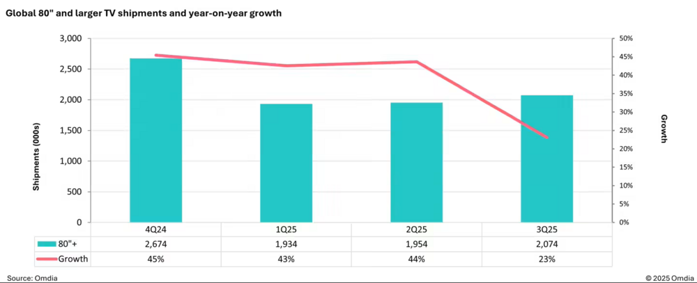 中国市场的放缓也直接冲击了大尺寸电视的增长。80 英寸及以上电视的季度增速已从去年的超过 40% 骤降至 23.1%,70-79 英寸品类的增速也冷却至 1.1%。