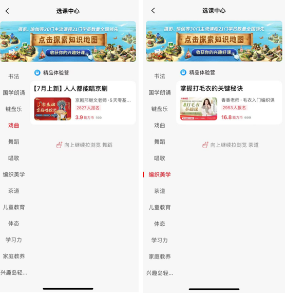 在具备收益潜力的课程面临重重挑战时,未来如何开发新课程、有效触达并吸引中老年群体,无疑是亟待解决的难题。但并非所有课程都能像太极养生课程那样,同时具备“高信息差”和“易制造焦虑”的双重特性。例如,兴趣岛的茶艺、戏曲、国学朗诵等课程,本质上聚焦的是小众人群的需求。