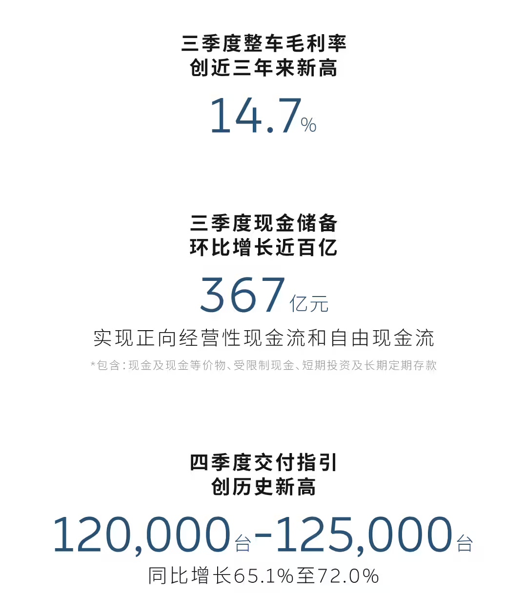 三季度综合毛利率 13.9%,创近三年来新高,产品和服务盈利能力显著增强。三季度整车毛利率 14.7%,创近三年新高。三季度现金储备 367 亿元,环比大幅增长近百亿,实现正向经营性现金流和自由现金流。