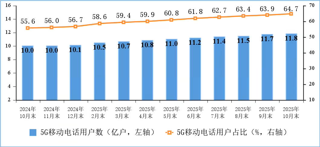 DoNews11月26日消息,今天上午,工信部发布了 2025 年前 10 个月通信业经济运行情况。从数据中获悉,截至 10 月末,三家基础电信企业及中国广电的移动电话用户总数达 18.3 亿户,比上年末净增 4015 万户。其中,5G 移动电话用户达 11.84 亿户,比上年末净增 1.7 亿户,占移动电话用户的 64.7%。