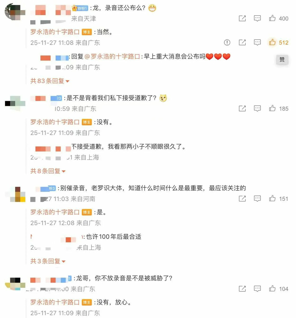 DoNews11月27日消息,今日有网友在@罗永浩的十字路口 最新一条博文的评论区询问:“录音还公布么?”罗永浩回复称:“当然。”也有网友问:“是不是背着我们私下接受道歉了?”罗永浩回复称:“没有。”还有网友提问:“龙哥,你不放录音是不是被威胁了?”对此,罗永浩回复称:“没有,放心。”