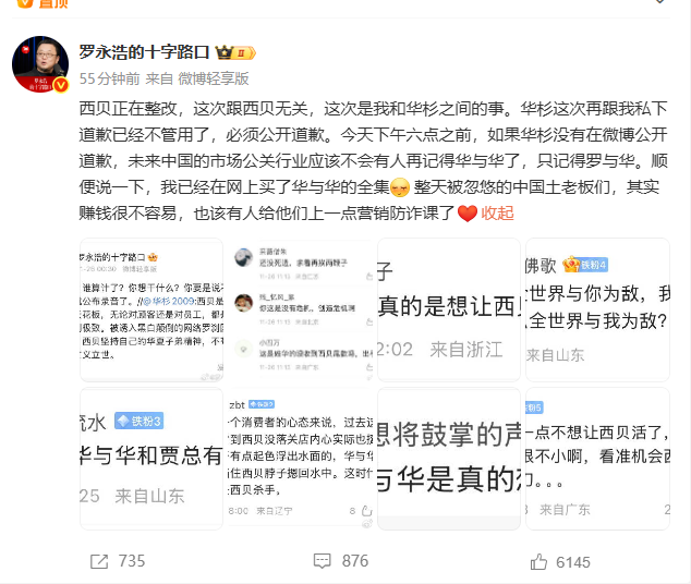随后,11月26日,罗永浩再发文称:“西贝正在整改,这次跟西贝无关,这次是我和华杉之间的事。华杉这次再跟我私下道歉已经不管用了,必须公开道歉。今天下午六点之前,如果华杉没有在微博公开道歉,未来中国的市场公关行业应该不会有人再记得华与华了,只记得罗与华。顺便说一下,我已经在网上买了华与华的全集。整天被忽悠的中国土老板们,其实赚钱很不容易,也该有人给他们上一点营销防诈课了。”