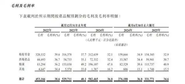 与高营销投入形成反差的是,其核心产品毛利率呈下滑态势。作为营收支柱的梅干零食,毛利率从2022年的39.6%逐步降至2024年的32.1%;西梅产品的毛利率同步从36.7%下滑至32.4%;毛利率较高的梅冻产品,也从2023年的49.2%微降至2024年的47.8%。