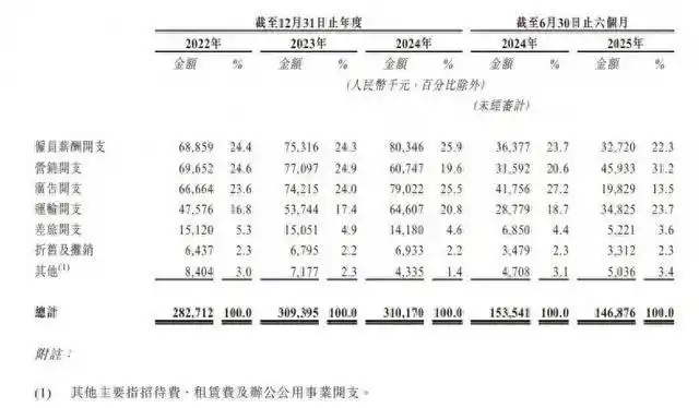 据上市申请文件,近几年,溜溜果园的销售及经销开支逐年走高,2022年至2024年分别为2.83亿元、3.09亿元、3.1亿元。其中,各期广告开支分别为6666.4万元、7421.5万元、7902.2万元;营销开支分别为6965.2万元、7709.7万元、6074.7万元。今年上半年,其营销开支及广告开支合计6576.2万元,占销售及经销开支的44.7%。