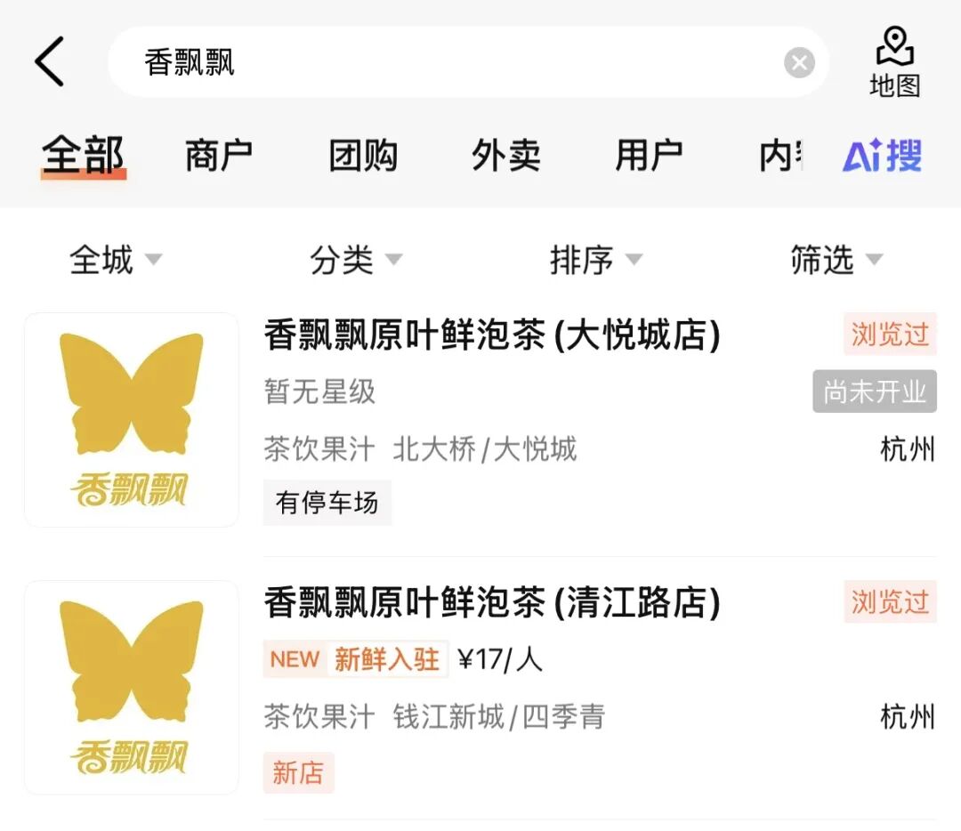 DoNews在大众点评APP内看到,香飘飘全国首店位于杭州大悦城内,仍处于筹备状态,尚未正式开业,品类为“茶饮果汁”。