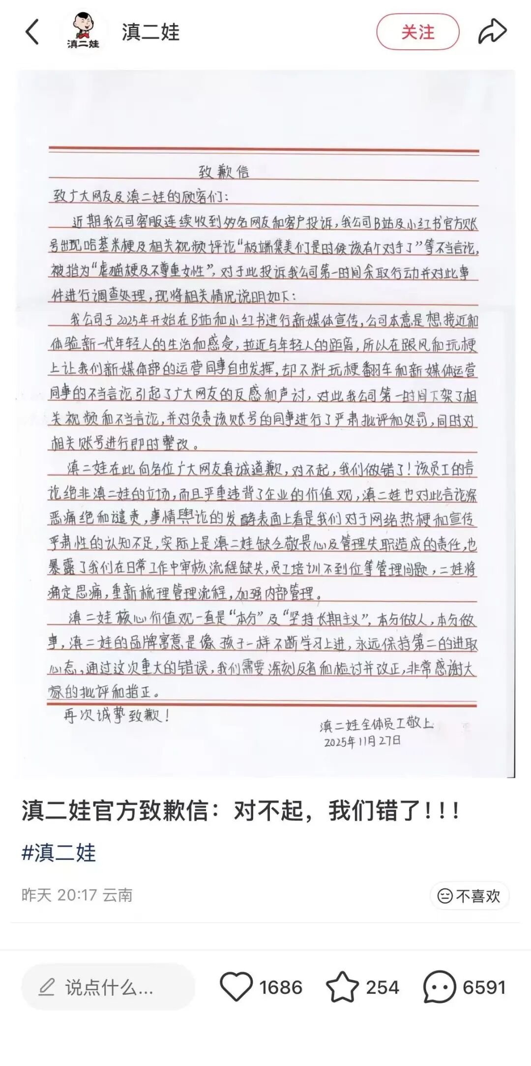 致歉信中提到,公司于2025年开始在B站和小红书进行新媒体宣传,本意是想接近和体验新一代年轻人的生活和感受,拉近与年轻人的距离,所以在跟风和玩梗上让新媒体部的运营同事自由发挥,不料玩梗翻车和新媒体运营同事的不当言论引起网友反感和声讨。