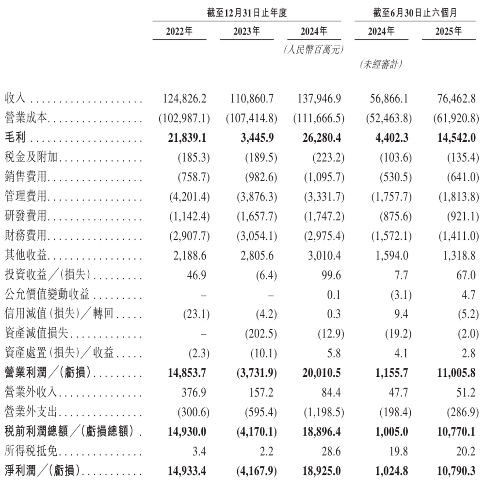 牧原食品2025年上半年营收为764.63亿元,较上年同期的568.66亿元增长34.5%;毛利为145.42亿元,上年同期的毛利为44亿元;经营利润为110亿元,上年同期的经营利润为11.56亿元;净利为107.9亿元,上年同期的净利为10.25亿元。