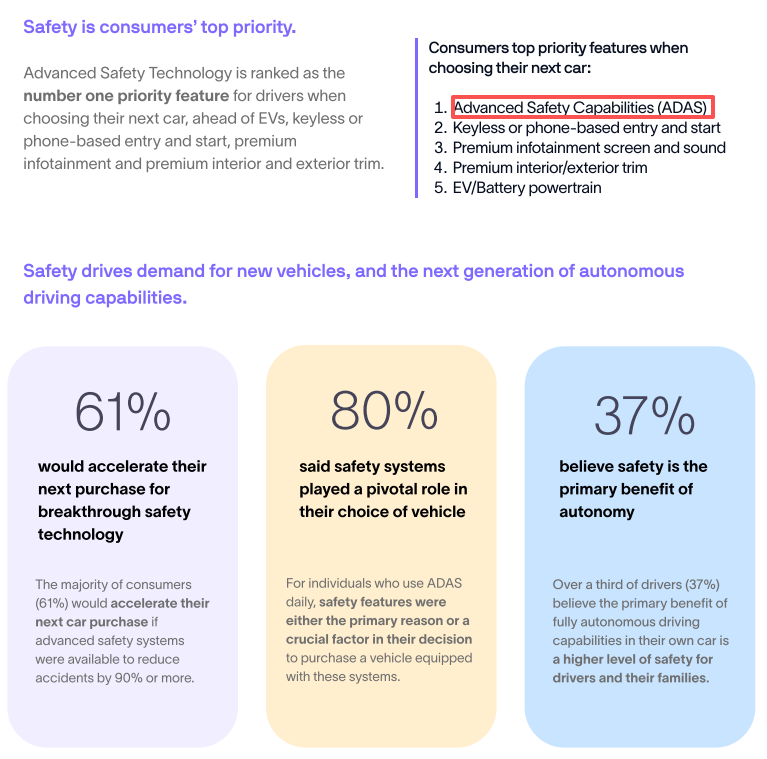 《Autonomous Vehicles: Consumer Trends and Attitudes Survey》报告指出,“高级安全技术”已成为消费者购车时的首选配置,其重要性超过电动化、智能互联等热门概念。更有61%的用户明确表示:若能证明某系统可降低90%以上事故风险,他们将毫不犹豫地加速购买决策。