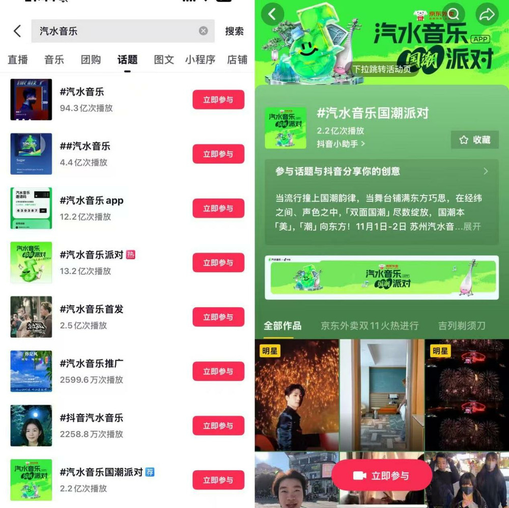 但背靠大树好乘凉。彼时日活用户量超7亿的抖音,通过站内信、视频推荐、一键跳转等无缝导流,持续的为汽水音乐输送精准流量。比如用户在抖音刷到心仪的 BGM,可一键跳转至汽水音乐收听完整版;遇到想搜原唱的背景音乐,右下角图标会自动引导跳转;平台内 #汽水音乐相关话题累计播放量达几十亿次。