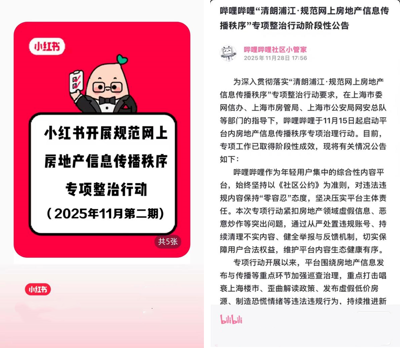 专项行动开展以来,已指导小红书、哔哩哔哩等网站平台自查清理涉唱衰楼市、歪曲解读房产政策等违法违规和不良信息4万余条,处置违规房产类账号7万余个,处置违规直播间1200余个,并定期发布治理公告。