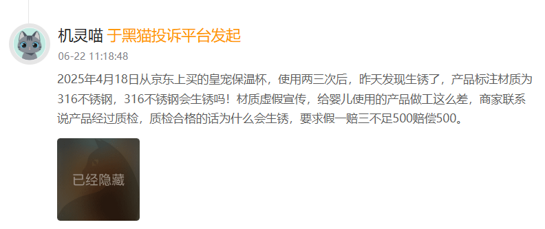 消费者表示,4月18日从京东上买的皇宠保温杯,使用两三次后,发现生锈了,产品标注材质为316不锈钢,怀疑材质虚假宣传,给婴儿使用的产品做工这么差,商家联系说产品经过质检,质检合格的话为什么会生锈,要求假一赔三,不足500元赔偿500元。