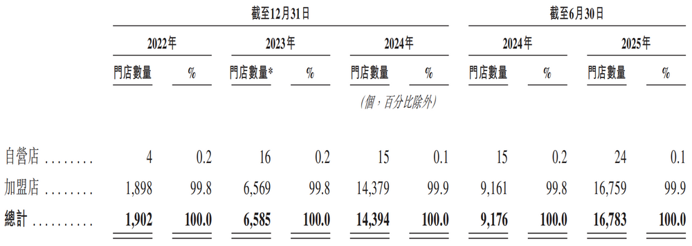 2022年至2024年及2025年上半年,加盟店数量占总门店数量的比例分别为99.8%、99.8%、99.9%和99.9%。而鸣鸣很忙来自加盟店的收入分别为42.43亿元、102.00亿元、388.88亿元和278.05亿元,占营收的比例分别为99.0%、99.1%、98.8%和98.9%。可见,鸣鸣很忙的业绩受加盟店业绩的显著影响,其业绩表现主要取决于与加盟商的合作能否成功。