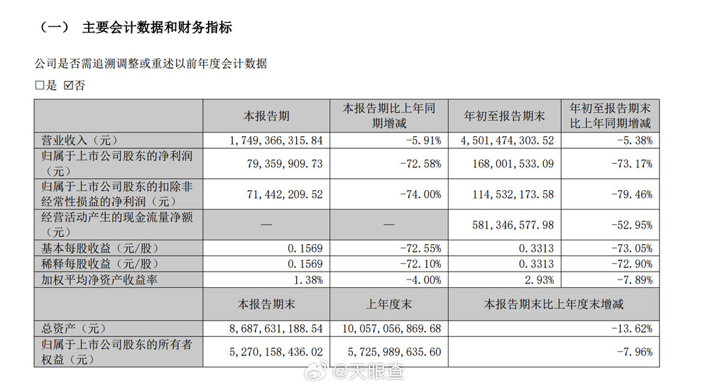 天眼查APP显示,安徽洽洽食品成立于2001年8月,财报显示,第三季度,洽洽食品实现营业收入 17.49 亿元,同比下降 5.91%;然而归母净利润却只有 7935.99 万元,同比下滑 72.58%。
