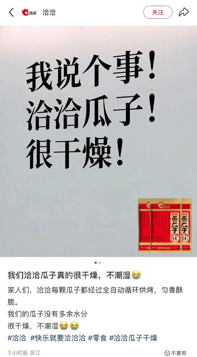 DoNews12月3日消息,近日,洽洽小红书官号宣传 “瓜子无多余水分”,还回复 “洽洽瓜紫≠洽洽瓜子”,被指用谐音梗内涵杨紫《国色芳华》数据注水。明星粉丝纷纷要求洽洽瓜子道歉,洽洽曾赞助杨紫主演剧集《承欢记》《长相思》,此次行为被质疑"背刺合作艺人"。