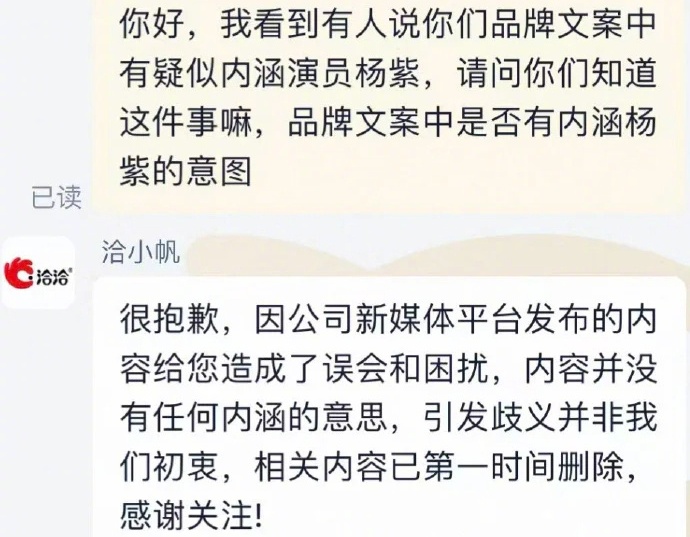 对此,洽洽食品官方旗舰店客服回应称:“内容并没有任何内涵的意思,引发歧义并非我们初衷,相关内容已第一时间删除。