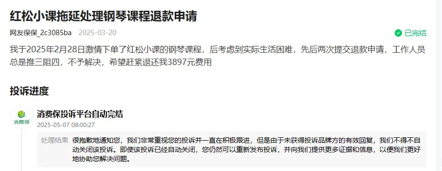 与之形成鲜明对比的是,集团旗下红松小课学员深陷“退费难”的困境。在消费保平台上,网友称,“自己在今年2月底购买的红松小课钢琴课程,后因现实生活规划调整,先后两次提交退款申请,却遭遇工作人员推诿,退款诉求迟迟得不到解决,期望能追回3897元课程费用。”但因消费保未获得投诉品牌方的有效回复,该投诉只能自动关闭。