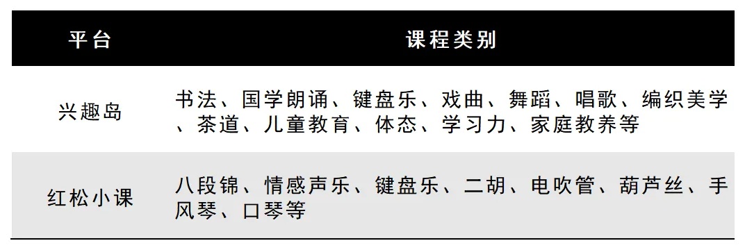 与十方融海、兴趣岛等其他面向中老年的课程机构模式对比,红松小课有两大“差异化”特征,但也暗藏天然缺陷。一方面,红松小课主打兴趣类课程,但聚焦于乐器、传统养生等细分领域,课程品类相对单一,受众人群小众。而兴趣岛课程类别涵盖书法、国学朗诵、儿童教育等,课程数量多,受众群体更广。这种聚焦虽能在细分领域沉淀用户,但也让客群基数受限,更依赖“高溢价转化”维持盈利。