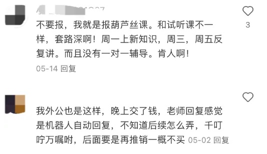 首先,核心客群挖掘见顶,“易成交客户”已逐步消化。剩下的潜在客户或是价格敏感性客户,或因平台口碑下滑而犹豫。例如,购买过红松小课葫芦丝课的网友爆料,其试听课和正课完全是两回事——正课里每周一刚教点新知识,周三、周五就开始来回“炒冷饭”,想找老师要一对一辅导更是没指望,直言“花钱找罪受,套路深到绕晕人”。